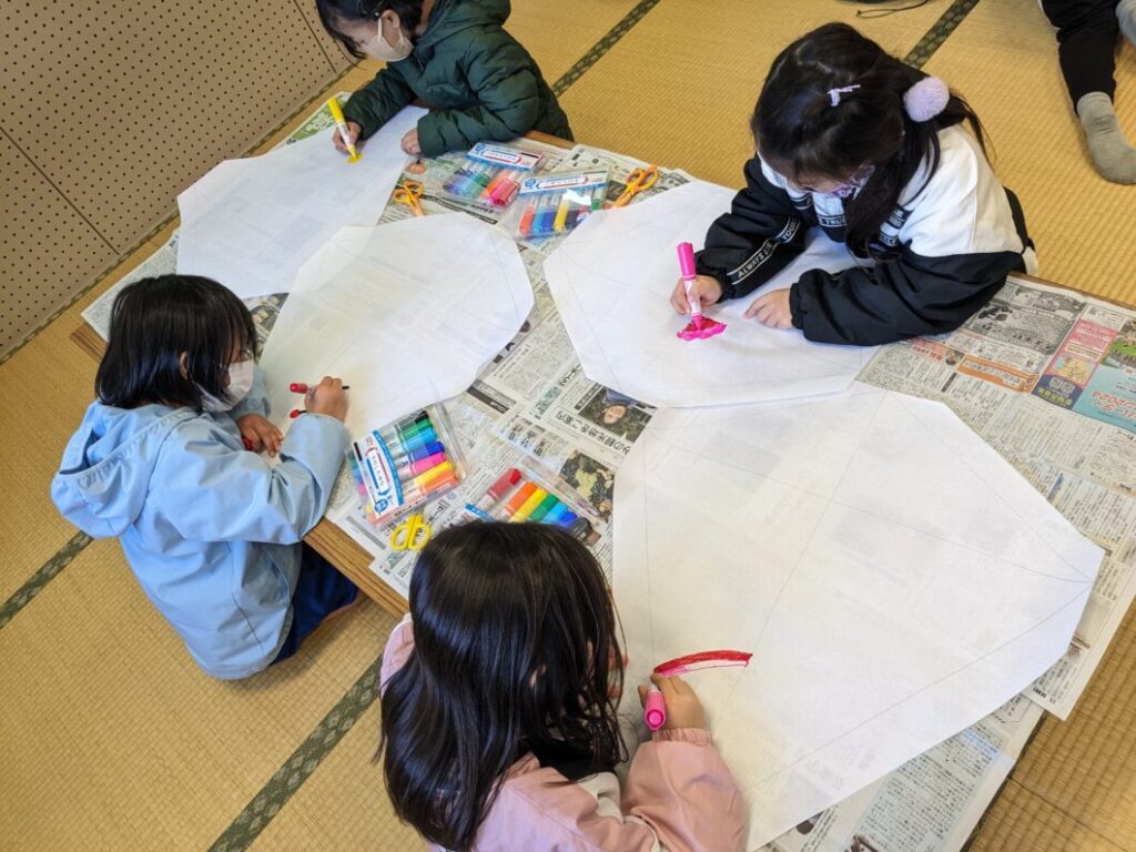 今回は凧づくりと竹下駄(竹ぽっくり)遊びです。