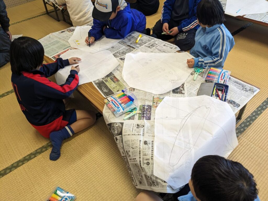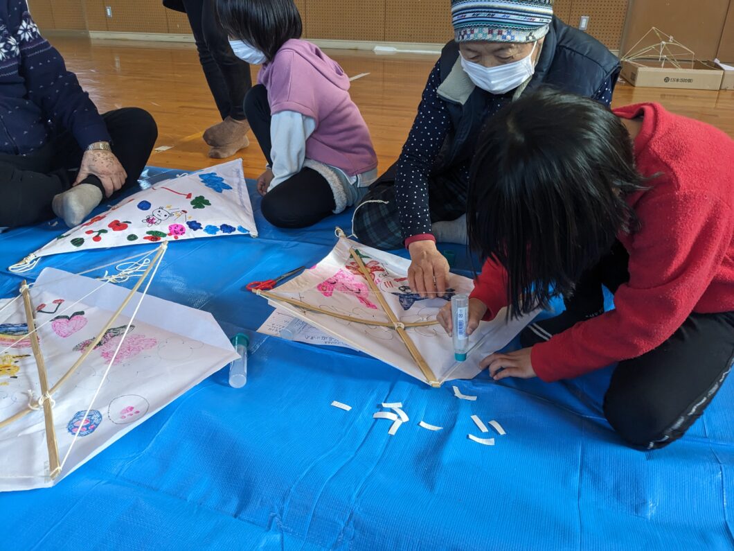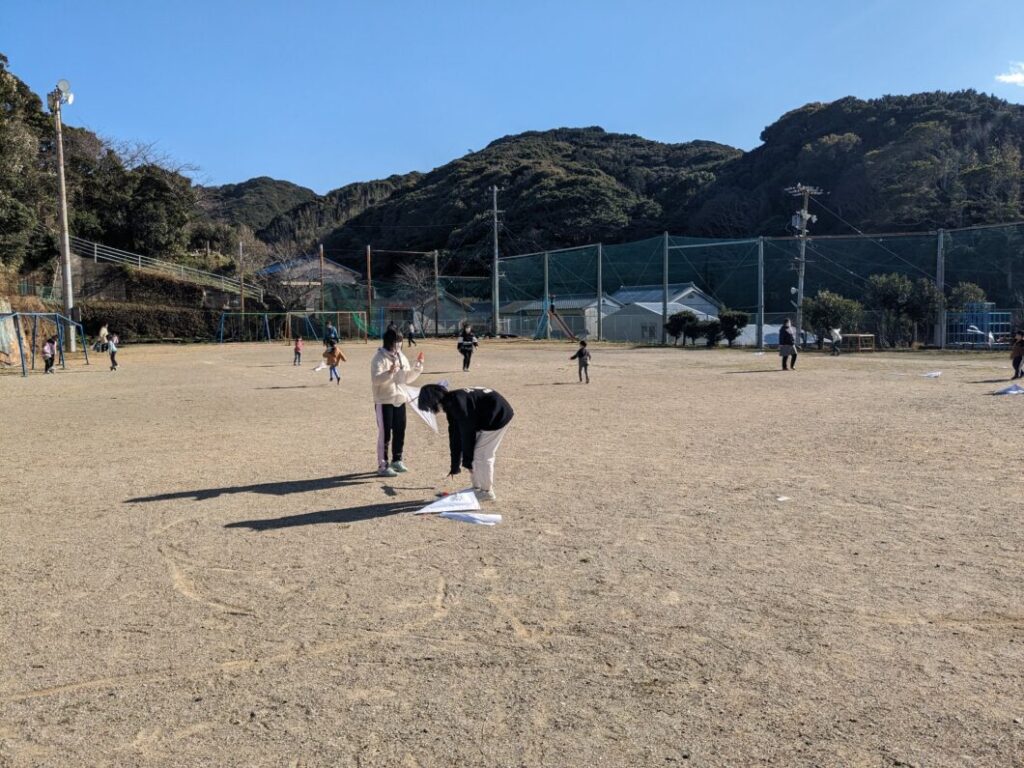 当日は風が凪いでいたり、尾がちょっと短かったりとあまり上手にあがりませんでしたが、子供たちは自分で描いた絵の凧を持ち、運動場を走り回っていました。