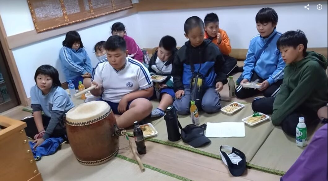 山の神の祭事が行われる数日前から、小学生が太鼓をたたき各家を回りお供えを頂戴します。