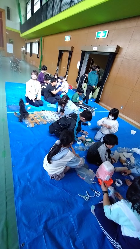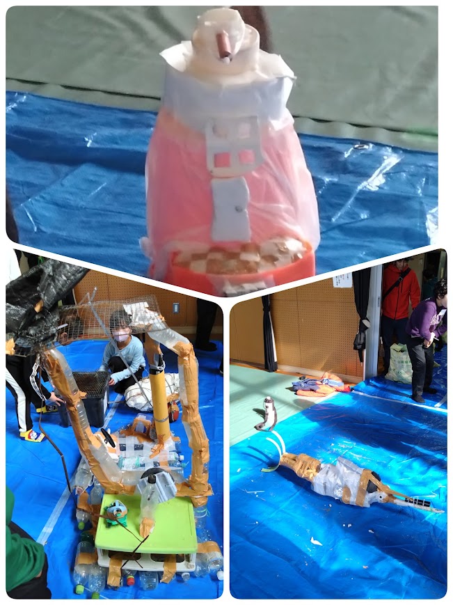 しっかりゴミについて学んだところで、午前中にしろんご浜で拾ってきたゴミを使ってアート作品を作ることに挑戦!