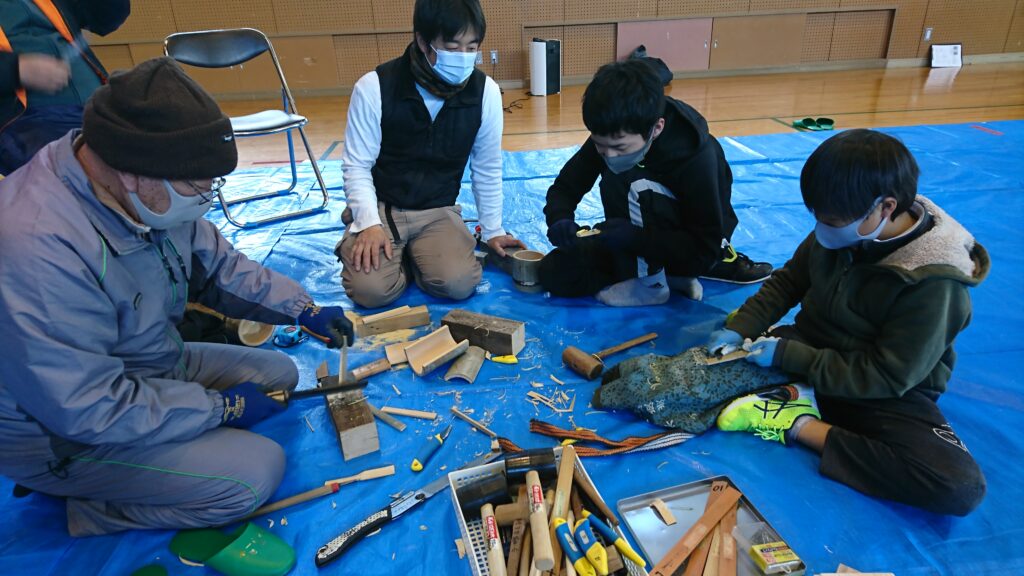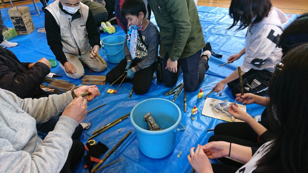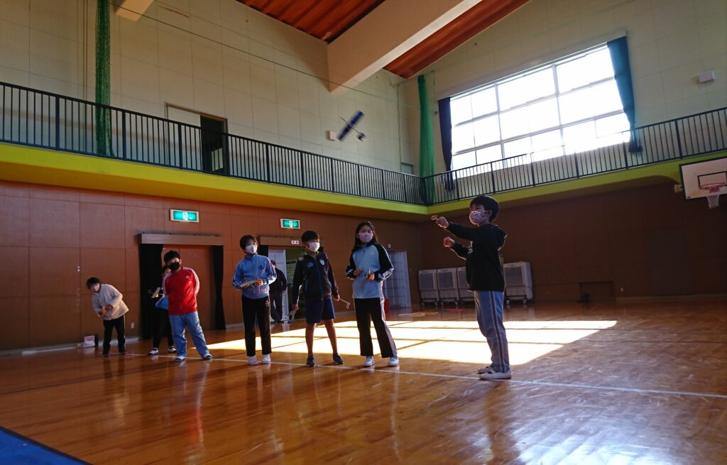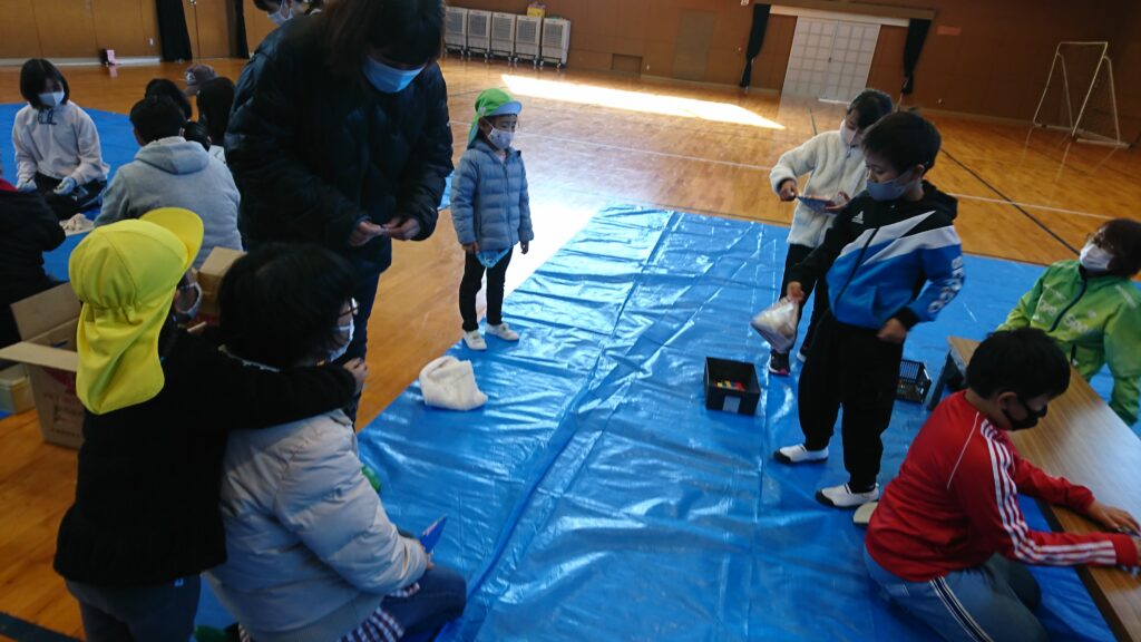 2021年2月15日、コミュニティースクールの活動で、今年も老人クラブの皆さまにお願いして昔遊び体験を行いました。昨年度の経験をいかし、今年は事前の準備から入念に用意をしてきてくれました。